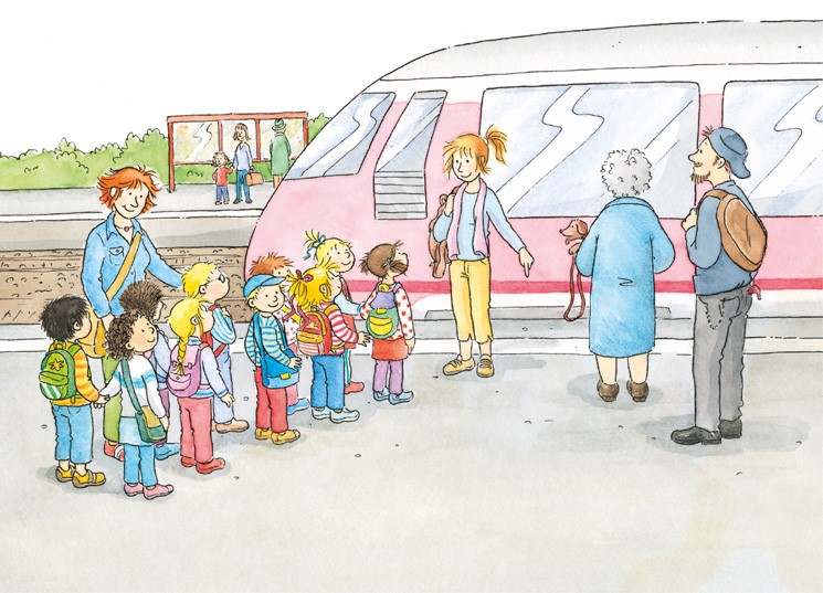 Там уже собрались её друзья. Воспитательница Ханна выстраивает их в колонну по парам – так ей проще всех пересчитать. А потом они спокойно заходят в поезд и ищут свободные места. Конни, конечно, садится рядом с Юлией.