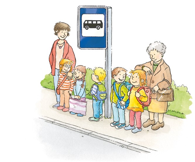 – К транспортному средству можно подходить, только когда оно полностью остановится, – объясняет Ханна. – И, пожалуйста, снимите в автобусе свои рюкзачки и поставьте их перед собой под сиденье. В проходе ставить сумки и рюкзаки нельзя: они могут разлететься, если водителю придётся резко затормозить.