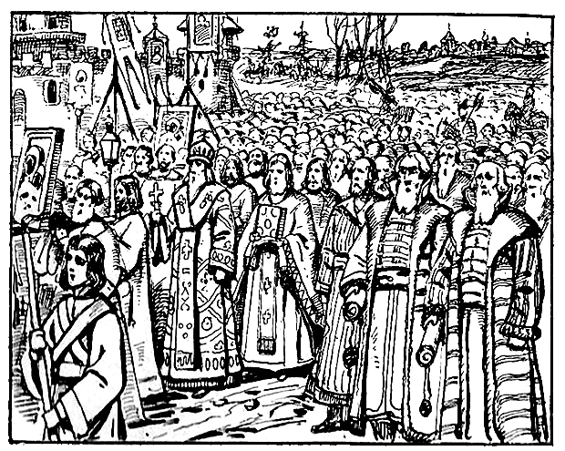 Архиепископ Феодорит с тремя архимандритами, с троицким келарем Авраамием Палицыным и с протопопами были впереди… Над головами их плыла чудотворная икона Владимирской Божией Матери… За ней другие, местные, из костромских церквей…