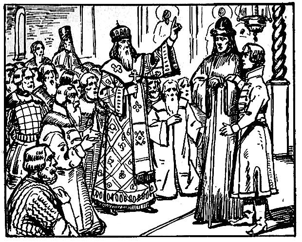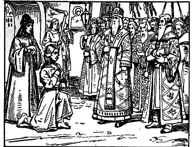 И с этими словами верный дядька помогал спешно одеваться своему любимому боярчику… Он накинул на своего любимца лучший парчовый кафтан и отороченную дорогим соболем шапку и с тем же торжественным лицом вывел его за руку из светлицы. Старица Марфа ждала в своей келье сына, и лишь только он появился, молча обняла его, глубоко заглянула в задумчивые глаза юноши и повела его к воротам монастыря…
