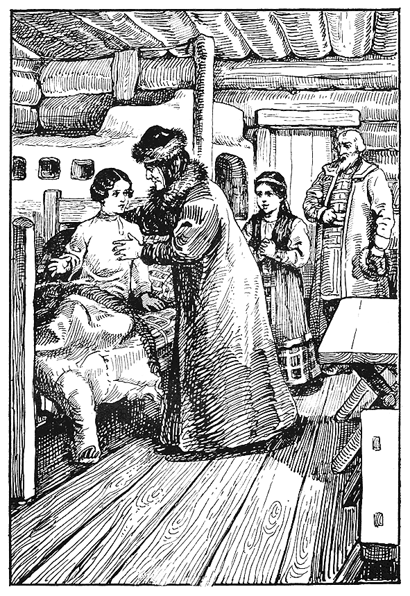 Изредка только за невысоким тыном на небольшом дворике таинственной избушки мелькнет темная фигура в платке или бледное лицо с резко очерченными черными бровями. Или же к маленькому слюдовому оконцу тесно приникнет то же бледное печальное лицо. Зато у узницы все есть в ее скромном жилище. И священник, отец Ермолай, и поселенцы доставляют ей сюда и рыбу, и яйца, и хлеб.