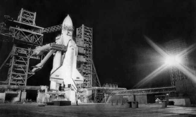 Ракета-носитель «Энергия» с многоразовым космическим кораблем «Буран» на пусковой площадке космодрома «Байконур».