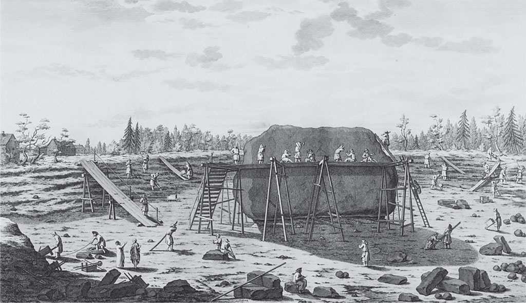 «Обтесывание камня Гром у Лахты». Гравюра Якоба Шлея по рисунку Юрия Фельтена