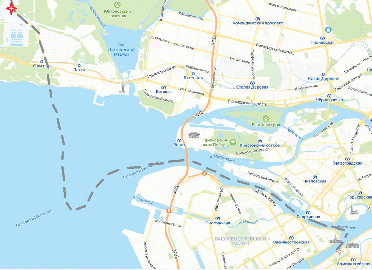 Пунктиром отмечен путь, по которому доставляли Гром-камень от места его нахождения близ Конной Лахты до Сенатской площади