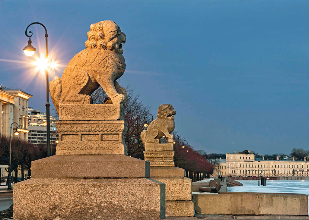 Египетские скульптуры – не единственные заморские гости Северной столицы. На Петровской набережной Невы уже в начале XX века появились китайские львы Ши-Цза. Изготовленные из маньчжурского гранита и доставленные из города Гирина в Санкт-Петербург, изваяния были первоначально подарены китайцами приамурскому генерал-губернатору Н. И. Гродекову. Он же, в свою очередь, решил подарить их Петербургу и сам оплатил транспортные расходы по отправке скульптур в столицу. Их решено было установить на недавно обустроенной и облаченной в гранит Петровской набережной напротив Домика Петра.