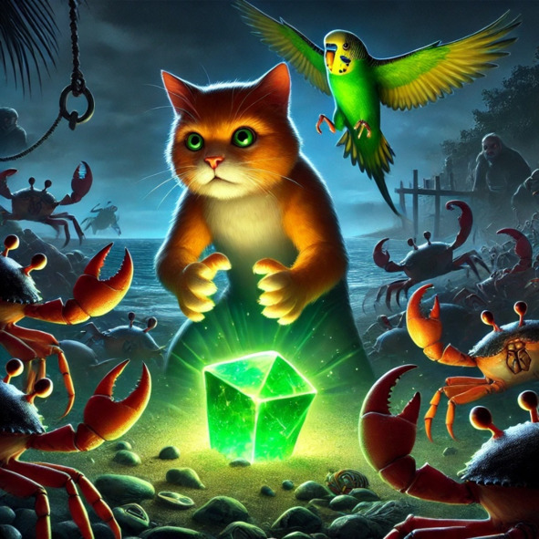 Через некоторое время Макс и Рико отправились в путешествие. Сперва они пошли на пляж, там бегало много крабов. Кот и попугай подумали: это они прячут волшебный изумрудный камень, но это оказались обычные крабы. На пляже было много баров, ресторанов и какое-то странное здание с табличкой «Луна и куча крабов». Кот и попугай вошли туда, а там злые крабы и волшебный изумрудный камень! Они попытались его забрать, но не получилось.