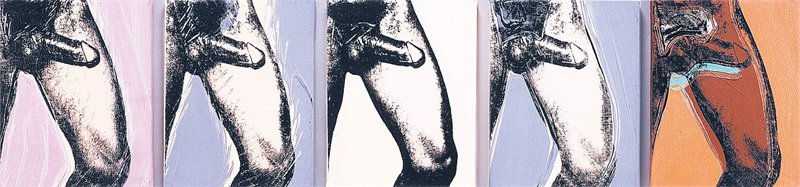 Картины Уорхола с изображением фрагментированного мужского тела, многие из которых весьма велики по размеру, хотя есть и маленькие, оставляющие впечатление интимности, чрезвычайно разнообразны по своим референциям и по тому, что можно назвать ассоциативным уровнем. С одной стороны, существует почти пятиметровая черно-белая работа, включающая шесть изображений мужского торса со сжатым у пениса кулаком. Хотя очевидно, что они основаны на полароидной секс-съемке, и хотя Энди, сосредотачивая взгляд на области между коленом и пупком, фокусирует свой образ – шесть раз подряд – на сексуальном значении, в равной степени – это отчасти насмешливый, отчасти благоговейный оммаж героическому мраморному «Давиду» Микеланджело, воспроизводящий его позу. Впрочем, в каком-то смысле совершенно логично, что художник, создавший работы на основе «Моны Лизы» и «Тайной вечери» Леонардо, обратился за вдохновением к Микеланджело. С другой стороны, Уорхол нередко создает свои фрагментарные фигуры с опорой на менее очевидные исторические прецеденты, предлагая зрителю такие крупные планы задов, которые даже Дега в своей серии «Бордель», созданной столетием ранее и столь близкой по духу мужским обнаженным фигурам Энди и его собственным «Купальщицам», вероятно, нашел бы слишком вызывающими. В двух картинах с изображением ягодиц художник ловко отвлекает внимание от чересчур призывного ануса с помощью изобретательной колористической игры и энергичного, нарисованного пальцами декоративного обрамления.