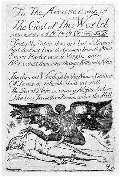 Однако же оборотной стороной уязвимости и вспыльчивости Блейка была упрямая, из ряда вон выходящая уверенность в себе: он неизменно превозносил себя до небес, равняя с Рафаэлем или Дюрером (как правило, на эту примечательную черту внимания не обращают). Лишь непоколебимая убежденность в собственной неповторимости и непогрешимости и позволила Блейку создать целую мифологическую систему; но, словно отказываясь признавать свой самоочевидный неуспех в этом мире, он всеми силами старался укрепить и повысить свой статус в “мире духовном”, каковой почитал истинной целью всех своих устремлений.
