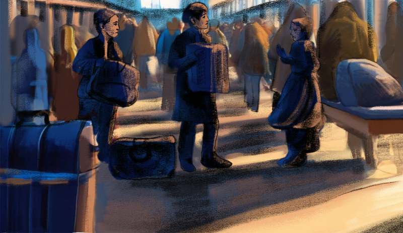 Вдруг дети развернули на своём пятачке импровизированный балаган. Мальчики, в основном, конечно, старший, расставили баулы прямоугольником, обозначая сцену. Одну большую сумку он выдвинул вперёд и расстегнул молнию – это было для денег. Девочка взяла в руки флажок и запрыгала на месте.