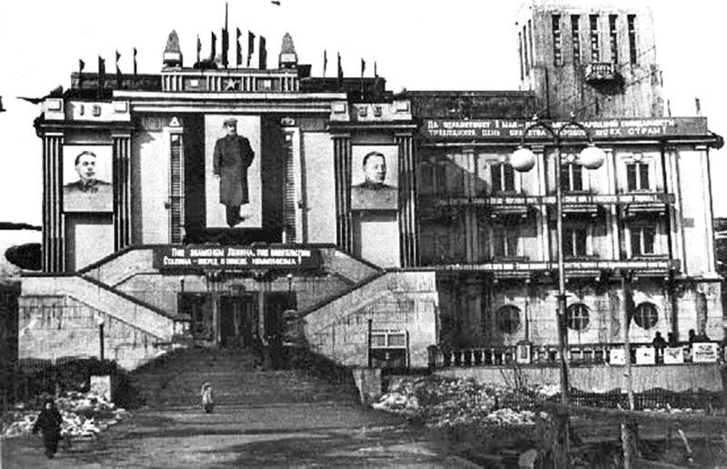 Слева от ДКАФа виден торец дома с колонами, в котором одно время жила семья Черанёвых – маминой средней сестры – Людмилы. Фотография, скорее всего, военной поры, т. к. на лозунге написано приветствие маршалу Сталину, а после войны он был уже генералиссимусом