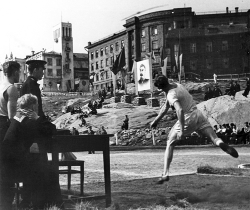 Стадион. На заднем плане – госпиталь, слева от него – ДКАФ. Круглые окна в нижнем этаже – бассейн. 1950-е годы
