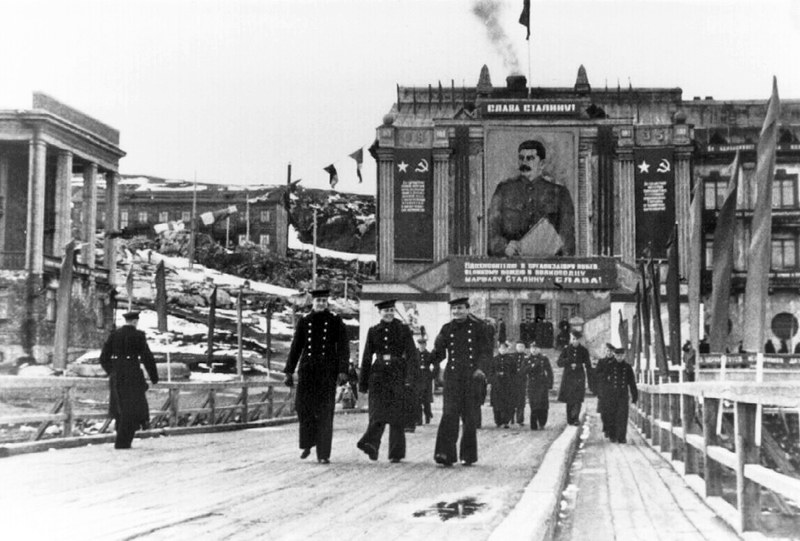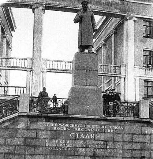 Памятник Сталину перед фасадом Циркульного дома. Сталин смотрит на Екатерининскую гавань. 1950 год