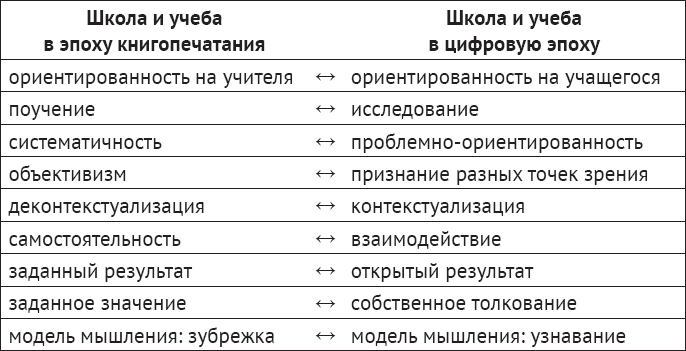 [Закрыть]. На основе меняющихся общественных запросов она показывает, что наши требования к школе и учебе в цифровую эпоху в корне отличаются от тех, что мы выдвигали в прошлую эпоху, прошедшую под эгидой книгопечатания. Разнонаправленные стрелки, добавленные автором к рисунку, указывают на то, что речь не идет об отмене и замене элементов на левой стороне. Новые подходы, перечисленные справа, присоединяются к ним, дополняя и изменяя наше понимание школы и учебы.