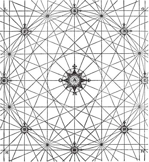 В компасе, изобретенном и описанном Перегрином, игла на стержне вращалась поверх градуированного диска, напоминающего астролябию. Однако и через сорок лет на карте Петра Весконте можно обнаружить одновременно и розу ветров, и изображение иглы на стержне. В самом деле, традиционно считается, что морской компас «изобрел» в 1302 г. неизвестный навигатор из Амальфи. Однако его «изобретение» состояло всего лишь в том, что он поднял розу ветров и закрепил ее непосредственно на магнитной иголке, где она находится и по сей день. Примерно в это же время – в конце XIII в. – розу ветров из восьми главных ветров с делением на половинные и четвертные ветра снабдили металлической чашечкой в центре для надевания на ось и двумя или больше магнитными иглами с обратной стороны. За следующие шесть столетий мореплавания дизайн и механическое устройство магнитного компаса изменились очень мало. Самая ранняя из сохранившихся компасных карт с буквенными обозначениями ветров приписывается Якобу Жиральдису (1426) и хранится в библиотеке Марчиана в Венеции. «Пункты» компаса и самой розы ветров переносились на морские карты. Из каждого из тридцати двух пунктов по периметру карты веером расходились линии («румбы»). Считалось, что по ним навигатор должен был определять направление движения.