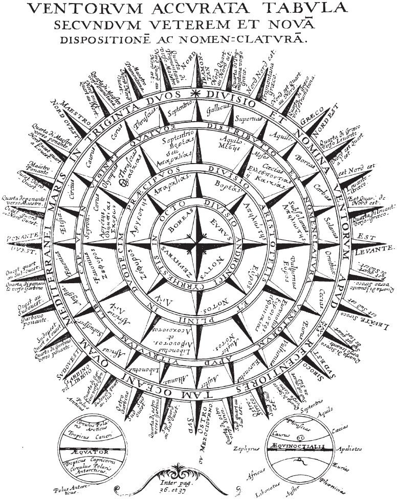 Составная роза ветров XVII в. Можно наблюдать эволюцию направлений от Гомеровой розы четырех ветров до 32-румбовой картушки современного компаса