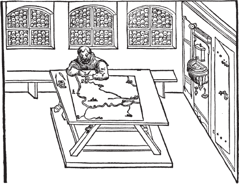 Самая ранняя гравюра по дереву, изображающая картографа за работой. Из «Геометрического метода» (Metodus Geometrica) Пауля Пфинцинга. Нюрнберг, 1598 г.