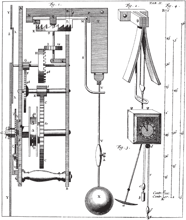 Гюйгенс – разносторонний и изобретательный ученый – соорудил, а в 1657 г. довел до совершенства первые надежные маятниковые часы; тем самым он произвел революцию в астрономии и впервые сделал возможным определение долготы. Устройства, показанные на рисунке, и сегодня знакомы каждому часовщику