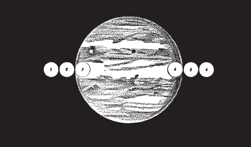 Юпитер и шесть положений его первого спутника. Астрономы XVII в. использовали его для определения разности долгот между двумя точками