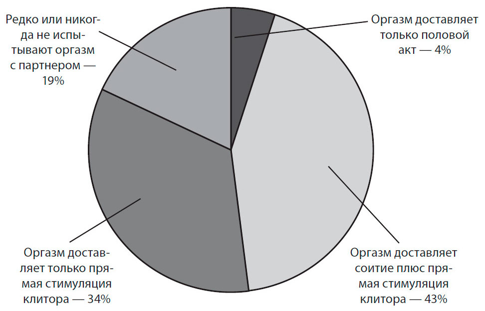 Вам интересно, что значит «подавляющее большинство»? Пишущие об этом журналы обычно приводят статистику, согласно которой лишь 25–30 % женщин могут достичь оргазма во время соития. Но, как отметил ученый, проанализировавший исследования, на основании которых была выведена эта статистика, есть одна серьезная проблема: в большинстве случаев они не учитывают разницу между дамами, которые могут испытать оргазм только от фрикций, и теми, кто испытывает оргазм во время полового акта благодаря дополнительной стимуляции клитора (например, трогая его рукой или прижимаясь им к пенису или лобковой кости). Интересно, что в двух отдельных недавних исследованиях, где эта разница была учтена, ученые обнаружили, что лишь около 15 % женщин могут получить оргазм в результате фрикций без стимуляции клитора. Показатели еще снижаются, когда я спрашиваю студенток, какой способ получить оргазм они считают самым надежным. Согласно средним данным анонимных опросов в моих классах за последние несколько лет для женщин:
