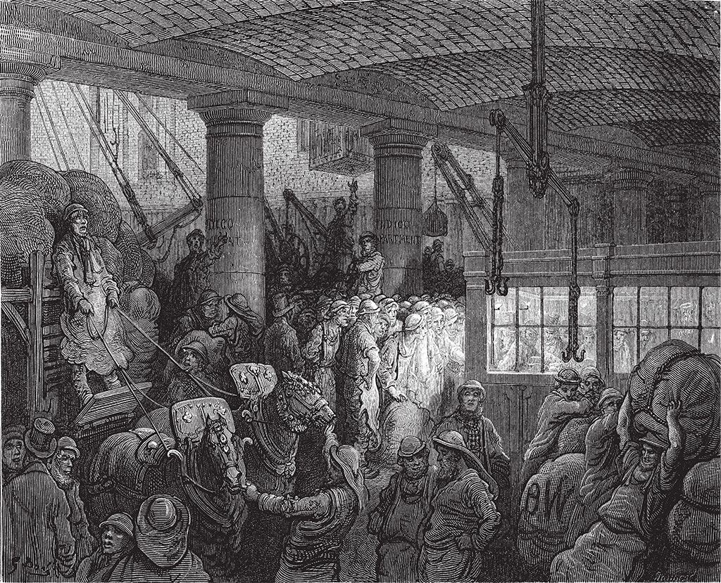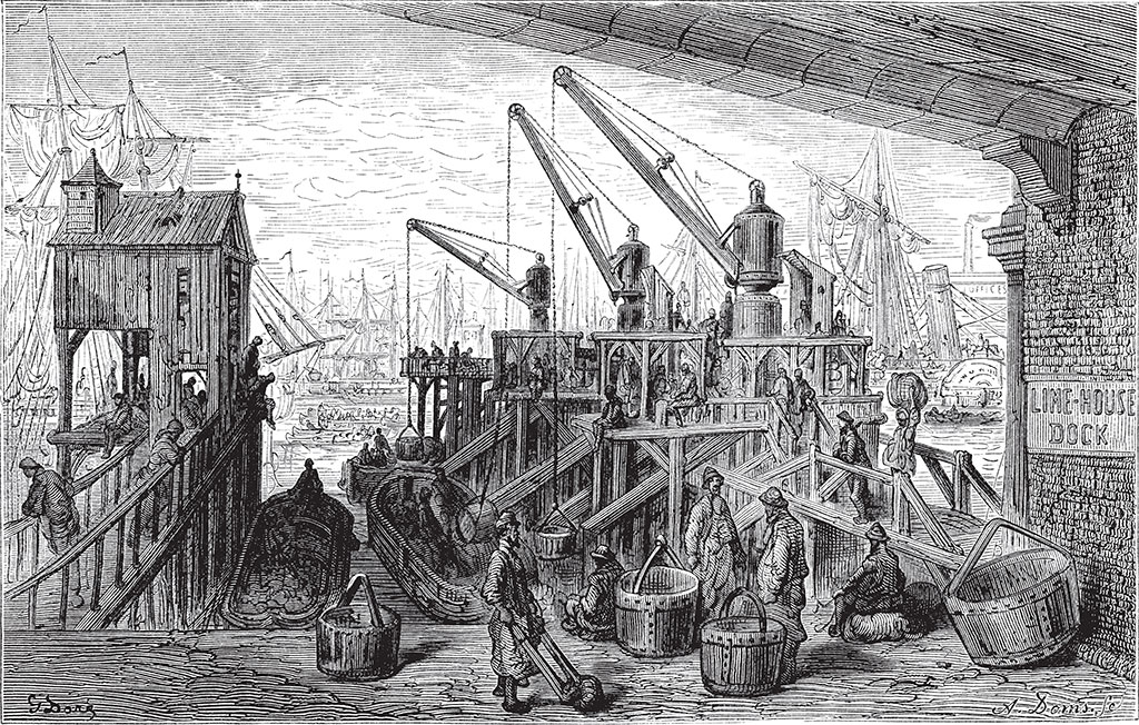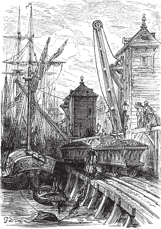 Доки Западной Индии (West India Docks) располагают самыми обширными гаванями в мире и занимают общую площадь в сто девятнадцать гектаров. По правде говоря, дух захватывает, когда попадаешь под их крышу. Проспект из мачт, лес такелажа, тросов и канатов простираются куда-то в бесконечность. Кажется, все торговые флотилии собрались в их просторных водах. Отсюда отправляются и сюда прибывают все, кто рыщет по свету в поисках сокровищ и привозит их в Лондон – эту бездонную пропасть, способную вместить в себя целую вселенную.
