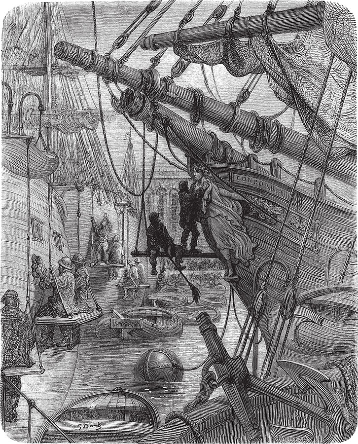 Доки притягивают к себе особый народ, чья жизнь напрямую зависит от их работы. Это люди особенные, которых ни с кем не спутаешь и не встретишь больше нигде, даже в Лондоне. В переулках, окружающих доки, живут чернорабочие, посыльные, водоносы и целая толпа людей разного сорта. Все они перебиваются случайными заработками и живут, как правило, довольно бедно за счет тех неопределенных ремесел, что требуются только в морских портах, и тех отраслей, которые я назвал бы акватическими, то есть связанными с водой. Вы не сделаете и двадцати шагов, не наткнувшись на лавку, забитую корабельными инструментами и матросской формой. Секстанты, хронометры, астролябии, компасы, подзорные трубы оспаривают право на сердце и последние экю моряков, отправляющихся в плавание. Торговцы поношенной одеждой и перелицованными шляпами, напротив, пытаются завлечь тех, кто только что сошел на берег, и выкладывают на прилавки наряды вопиюще дурного вкуса. Эти лавки и магазины предпочитают одну из двух вывесок: «Лорд Нельсон» и «Jolly Tar» (читай «Веселый моряк»).
