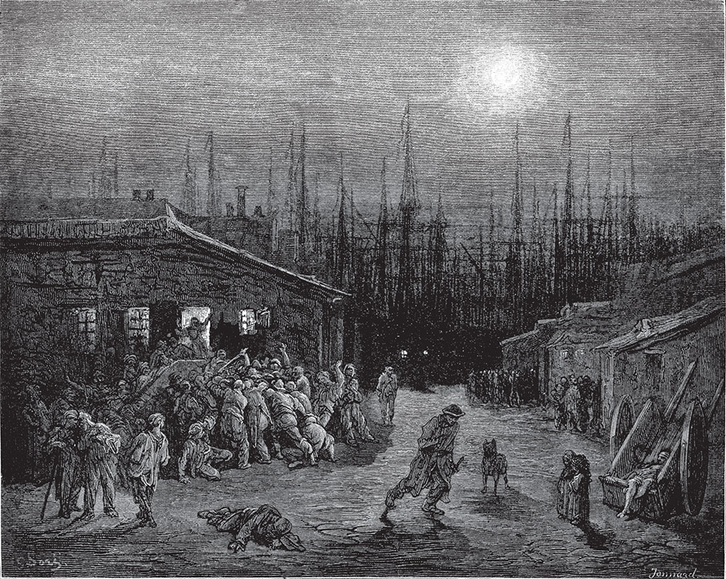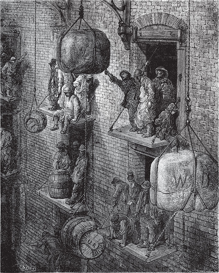 Над людским потоком и городским шумом, между небом и землей высится купол столичного собора. Его незыблемость и непостижимое спокойствие кажутся наделенными Божественным величием, коему и посвятил его великий английский народ. И в то же время у наших ног и над головами, везде и повсюду кипит работа. Река покрыта лодками, идущими в разных направлениях, поезда несутся по подвесным мостам и устремляются к городу так, как будто хотят вспороть его ударом бешеных локомотивов. Все приобретает лихорадочный вид, темный и болезненный, который создает у иностранца, впервые созерцающего эту картину, ощущение неблагополучия. Все беспощадно подавляют корыстные заботы. Все приносится в жертву практической пользе. Каждый как будто хочет уже быть там, куда еще не вышел; тюки с лодок не выгружаются, а выбрасываются; вокруг рыбного рынка – а это большое здание, которые мы видим справа, – такое движение, какое нам в Париже даже не снилось! Это целый мир внутри другого мира! Рядом высится большая Лондонская пивоварня, с чьими масштабами не сравнится ничто на нашем жалком континенте! Она олицетворяет силу и мощь лондонской деловитости и энергии.