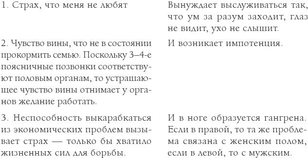 Прошло ещё три дня. Человек этот звонит и говорит, что теперь на кисти правой руки у него заметно усыхают или истончаются мышцы. У мужчины был стресс: «Если я не в силах улучшить жизнь женщин, то что я за мужчина, раз не могу обеспечить достойный уровень жизни собственной жене?» Поскольку дело касалось проблемы будущего, то рука пошла ему навстречу. Теперь этот симпатичный человек понял, что и кризис нужно уметь преодолевать правильно. Он простил страхам и самобичеванию. Через три дня рука была снова здорова.
