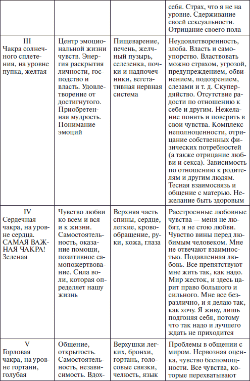 Посмотрите на характеризующую каждую чакру схему и почувствуйте, как она влияет на все тело. Вы испытываете очень своеобразные медитативные ощущения в каждом индивидуальном случае.