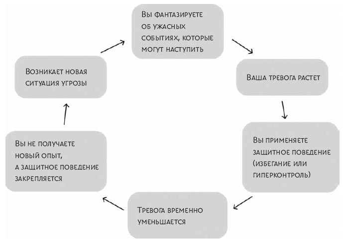 Чтобы понять, каким образом это происходит, вспомним механизм порочного круга тревоги. Почувствовав тревогу, мы стараемся избавиться от нее с помощью избегания и гиперконтроля. Следствием этого становится то, что в дальнейшем мы склонны переоценивать опасности и еще больше не уверены в собственных силах. А такой взгляд на вещи лишь усиливает тревогу.