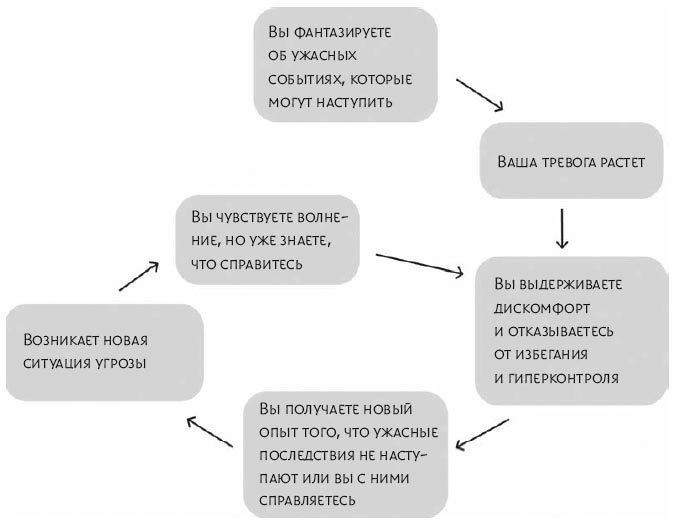 Один из самых важных результатов отказа от избегания и гиперконтроля – это то, что именно этот отказ в конечном итоге помогает уменьшить тревогу. Это настолько важно, что я повторю еще раз: когда мы перестаем использовать привычные способы мгновенного снижения тревоги, мы в итоге снижаем ее в долгосрочной перспективе.
