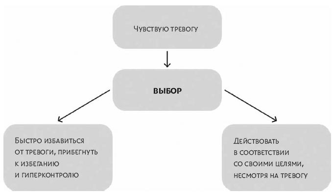 • Вы научились распознавать тревогу. Вы знаете, как она проявляется в ваших мыслях, в ваших телесных ощущениях, в ваших желаниях и действиях. Теперь вам намного проще заметить точку выбора. Это тот момент, когда вы ощутили тревогу и захотели быстро от нее избавиться с помощью избегания или гиперконтроля.