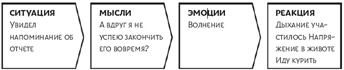 Вы пришли на работу, открыли календарь и увидели, что сегодня нужно сдать отчет. Тут же вы засомневались, успеете ли вы закончить его вовремя. Начали волноваться, и вот уже (возможно, незаметно для вас) слегка участилось ваше дыхание, появилось напряжение в животе. Все эти ощущения и мысли довольно дискомфортны, а дискомфорт мало кому нравится, так что вы решаете сперва перекурить – это тоже реакция. Вот как будет выглядеть наша схемка: