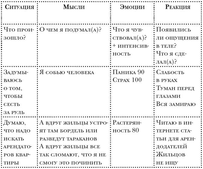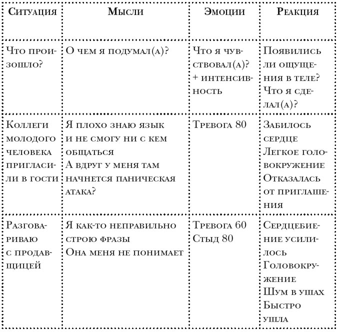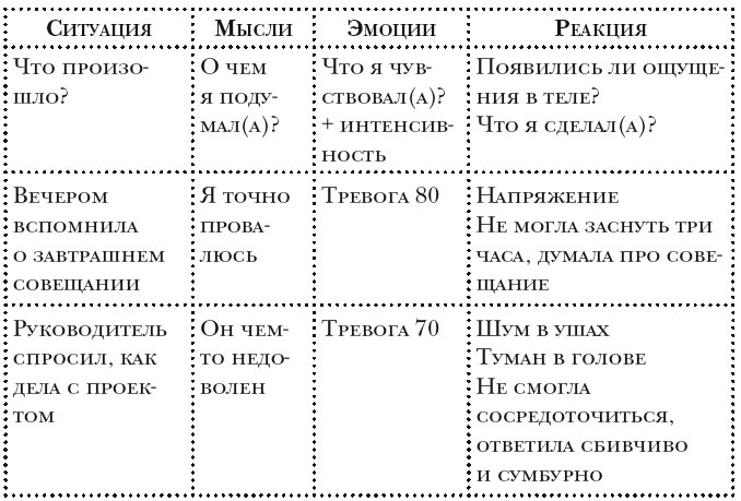 Пора выяснить, как работает механизм тревоги в вашем случае. Какие ситуации его провоцируют, какие мысли при этом возникают, как вы на них реагируете. Нам понадобится инструмент, который поможет вам разобраться в своих мыслях и эмоциях. И этот инструмент – когнитивно-поведенческий дневник мыслей.