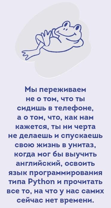 Мы переживаем не о том, что ты сидишь в телефоне, а о том, что, как нам кажется, ты ни черта не делаешь и спускаешь свою жизнь в унитаз, когда мог бы выучить английский, освоить язык программирования типа Python и прочитать все то, на что у нас самих сейчас нет времени. МЫ ПРОСТО ТЕБЕ ЗАВИДУЕМ.