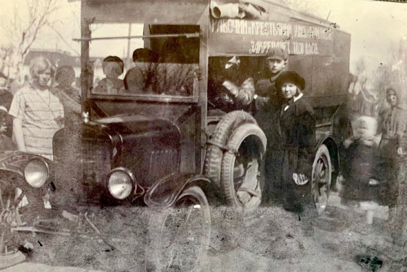 1927 год. Свердловск. На автомобиле лозунг: «Рабочий и крестьянин, учись! Грамотность закрепляет твою власть». Архив Е. В. Мезенцевой