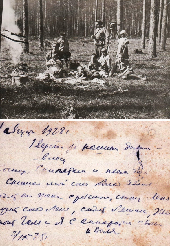 11.08.1928. Свердловск, посёлок Новый. Иван Нилович со своим фотоаппаратом. Часть подписи на обороте: «Одна верста (=1 066,8 м) за нашим домом в лесу. Скипятили и пьём чай. Фотографирует сосед». Личный архив