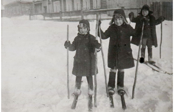 1930 год. Свердловск, ул. А. Толстого, 8. Катание на лыжах. Дети Мезенцевы. Личный архив