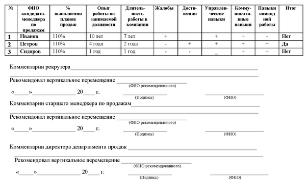 Пример оценочной анкеты менеджеров по продажам при вертикальном перемещении на вакансию начальника отдела продаж.