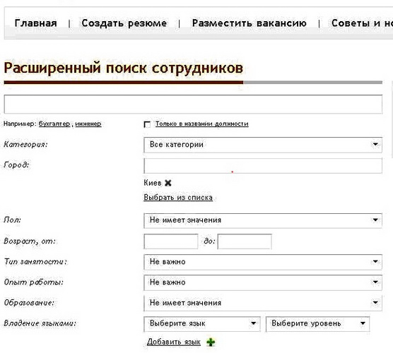 Каждый сайт по трудоустройству предлагает возможность поиска резюме по собственным базам соискателей. Визуально поисковая система у каждого сайта отличается, но в целом параметры поиска у разных сайтов очень похожи. Зачастую искать достаточно удобно, можно выбирать по многим параметрам, начиная от названия должности и города поиска работы до уровня образования и владения иностранными языками (смотрите Рис. 1)