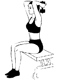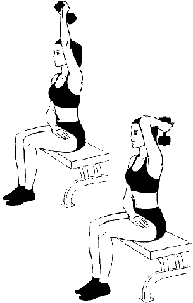 Сядьте прямо, напрягите мышцы пресса и спины. Возьмите гантель двумя руками за гриф поближе к верхнему блинчику, согните локти – это и будет ваше исходное положение. Медленно выжмите гантель вверх, над головой. Без паузы вернитесь в исходное положение. По мере развития силы увеличьте количество сетов до 3-х, а количество повторов – до 20. Когда с легкостью сможете выполнять 3 сета, усложните выполнение: делайте движения одной рукой (как на рисунке). Отдыхайте между сетами 1–2 минуты.