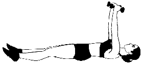 Примите положение лежа на полу или любой возвышенности, гантели держите прямыми руками над лицом (исходное положение).