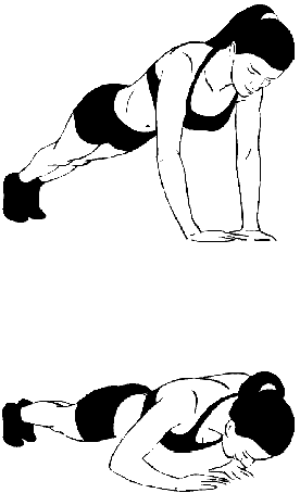 Напрягите мышцы живота и, медленно сгибая руки в локтях, опуститесь к полу – почти до касания носом. Так же медленно вернитесь в исходное положение. Не расстраивайтесь, если с первого раза у вас получится менее 5 раз. По мере развития силы вы сможете выполнять движения до 10–12, а затем и до 20 раз. Как только осилите 20 повторений, переходите к классическому варианту (с исходным положением – упор лежа на носки).