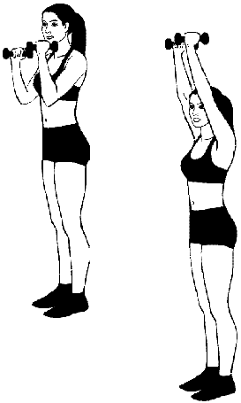 Медленно согните руки в локтях и опустите гантели за голову. Без паузы вернитесь в исходное положение. Если на начальном этапе вам сложно выполнять движение двумя гантелями, видоизмените упражнение: возьмите одну гантель двумя руками. Когда с легкостью сможете выполнять 3 сета по 15 повторов в каждом, переходите на вариант с двумя гантелями, постоянно увеличивая их вес. Отдыхайте между сетами 1–2 минуты.