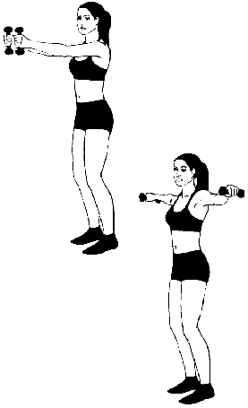 Соедините лопатки, поднимите гантели прямо перед собой до уровня плеч, затем опустите их к бедрам. Не задерживаясь, разведите руки в стороны также на высоту плеч.