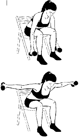 Возьмите гантели и сядьте на край стула, колени должны быть согнуты и располагаться точно над лодыжками. Опустите плечи, напрягите пресс. Выполните наклон вперед от бедер, руки свободно опущены вниз, ладони направлены друг к другу, локти слегка согнуты. Соединяя лопатки, медленно разведите руки в стороны, затем также медленно вернитесь в исходное положение. На начальном этапе возьмите гантели весом от 2 до 4 кг, в зависимости от вашего уровня подготовки. Начните с 1–2 сетов по 8–10 повторов в каждом. По мере развития силы увеличьте количество сетов до 3-х, а повторов – до 12. Отдыхайте 1–2 минуты между сетами.
