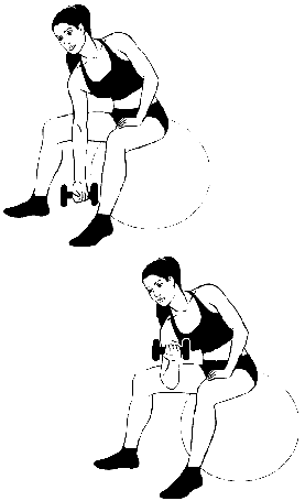 Для выполнения упражнения вам понадобится пара гантелей весом от 2 до 4 кг, в зависимости от вашего уровня подготовки. Упражнение идеально укрепляет мышцы плеч и бицепсы. Можно выполнять сидя на стуле или на фитболе. Сядьте на фитбол, колени согнуты, ноги на ширине плеч. Держа гантель в левой руке, наклоните корпус вперед и облокотитесь задней стороной плеча о внутреннюю поверхность бедра, ладонь свободно опущена вниз и направлена внутрь. Напрягите пресс, выпрямите спину, для опоры упритесь правой рукой в правое бедро. Сохраняя данное положение и не сгибая запястье, выполните подъем гантели к плечу. Медленно вернитесь в исходное положение. Сначала выполните все повторы одной рукой, затем – другой. Это и будет один сет. На начальном этапе начните с 1–2 сетов по 8–10 повторов в каждом. По мере развития силы увеличьте количество сетов до 3-х, а повторов – до 12. Отдыхайте 1–2 минуты между сетами.