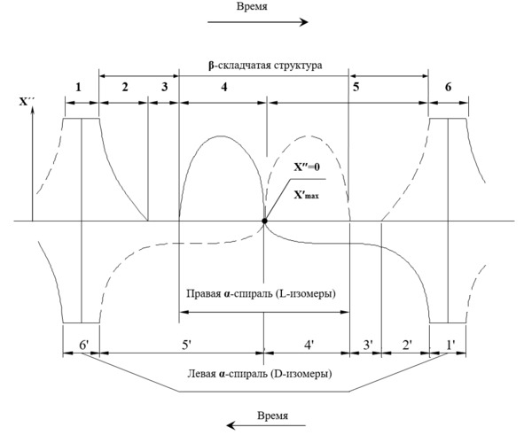 На рис.1 представлено протекание второй производной X'' энергии X активации химических реакций по времени: совмещение в одном процессе двух рудиментарных влечений (Эроса и Танатоса). Противоположная направленность протекания X'' в области локализации квазизамкнутой пространственной структуры глобулы (фазы 1—6 и 1'—6') вызвана контрвариантностью организующего вектора пространства-времени, имеющей физическую интерпретацию [2].
