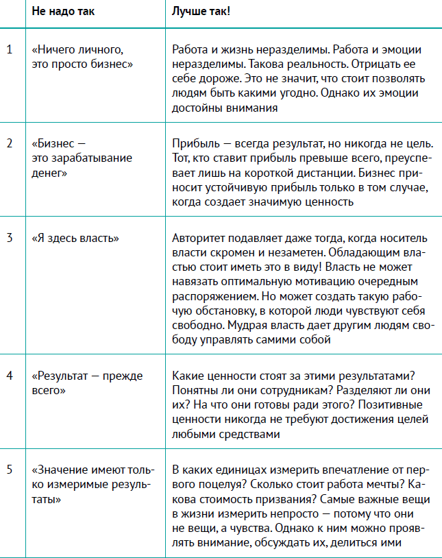 ▶ Называйте причины, по которым требуете тех или иных результатов, прежде чем требовать этих результатов. Не ставьте цели впереди ценностей, тем более не позволяйте им противоречить.