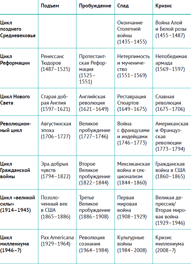 Все Кризисы, охватывающие шесть столетий англо-американской истории, происходили в чрезвычайно разных контекстах. Эти общества кардинально отличались друг от друга размерами, уровнем жизни, технологиями. И все же мы наблюдаем одну и ту же динамику – все фазы Кризиса всегда происходят в одном и том же фиксированном порядке.