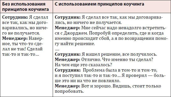 Для понимания того, как может работать коучинг в реальных условиях, можно сравнить два варианта действий для одной и той же ситуации: